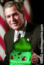 * George W. Bush is a hardcore PokÈmon trainer. Even before the cartoon popularized the sport, he was known to fight in PokÈmon arena battles all over the world. "You can do it Koffing! Use your gas attack on Porygon now!" he would shout to the delight of the crowds. His favorite PokÈmon to raise are Charmanders, but he's taken up with a Bulbasaur these days which we may yet see in action in the Middle East crisis. On a side note, people often think that George W appears foolish or even "retarded" when he says things like "subliminable" or "Laura and I really don't realize how bright our children is sometime until we get an objective analysis." What they don't realize is that he is just slipping into PokÈ-speak which is actually pretty intelligent if you think about it that way. For more smart George W Bush quotes go HERE.