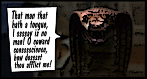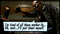 The Muffin Man goes the Freddy Krueger route and talks to his victims before doing them in. And you just have to hear the stuff that comes out of this diabolical muffin's mouth! In a heavy, demonic voice, he warns that "Fire beetles will nest in your rotted braaaaiiiin!!!" and "Your lungs will burn with sulphur! Your pleas for mercy will be etched on your foreheads with the red-hot blade of suffering!" It's like this cat's been listening to too many DEICIDE albums!