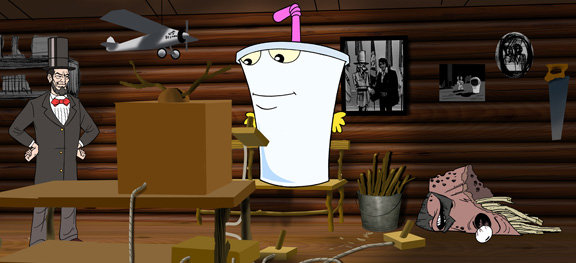 No, seriously, this is a real movie. Anyway, the Aqua Teens seek help from a VERY casually speaking Abraham Lincoln who builds them a wooden rocket ship to escape in...and just in time too because the CIA comes crashing into Lincoln's cabin, guns a'blazin', seconds after they leave. No, really, this is how the movie starts. Shut up.