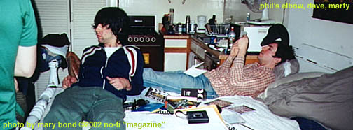 The house was a bit hidden and I had to brave a couple barking dogs beyond a gated area to find their recording studio, but luckily I love animals and the dogs were all bark, no bite! When I first arrived Al was on the computer working on some vocals that Marty was singing in "the producers office" a.k.a. the... Dave was sitting silently and Philip was fingering stuff on a keyboard. The room was very small and rather cramped, but you could tell they were used to it. There was another room right next to us that was full with band equipment and recording stuff. They had "The Royal Tennenbaums" playing on the TV with the sound off as they worked on the new songs- the ones I heard were called "Kissing The Boulevard" and "Stoner On The Moon". They informed me that they will be playing at the next The Sundance Film Festival and were also going to be on the cover of some West Coast music magazine this January that is given out at places such as Tower Records.